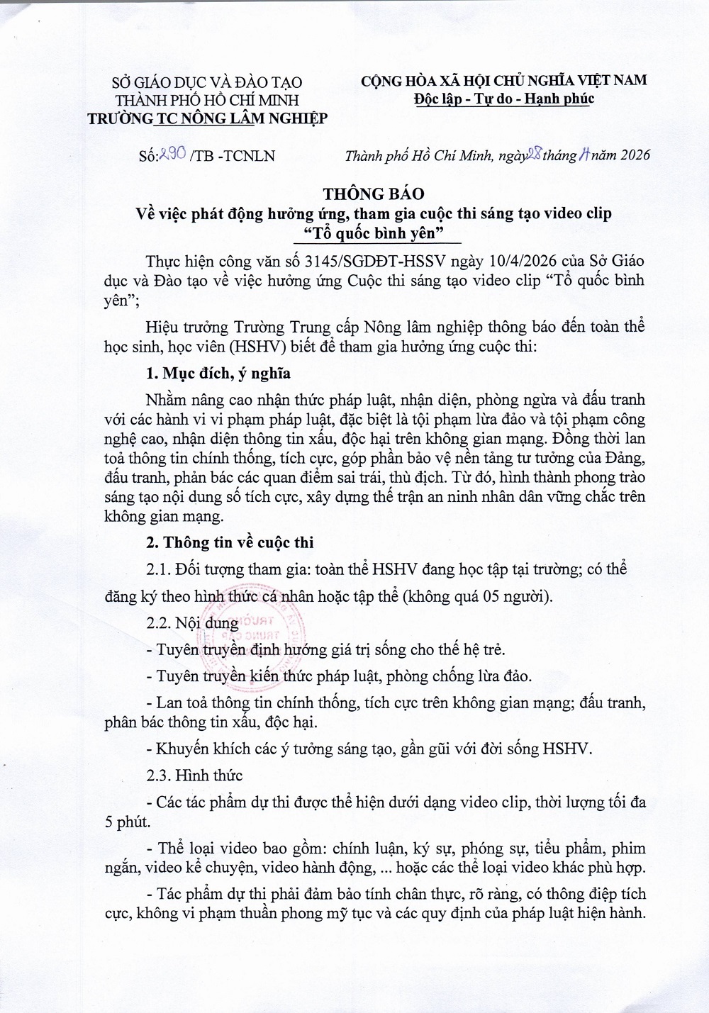 Thông báo phát động hưởng ứng, tham gia Cuộc thi sáng tạo video clip Tổ quốc bình yên