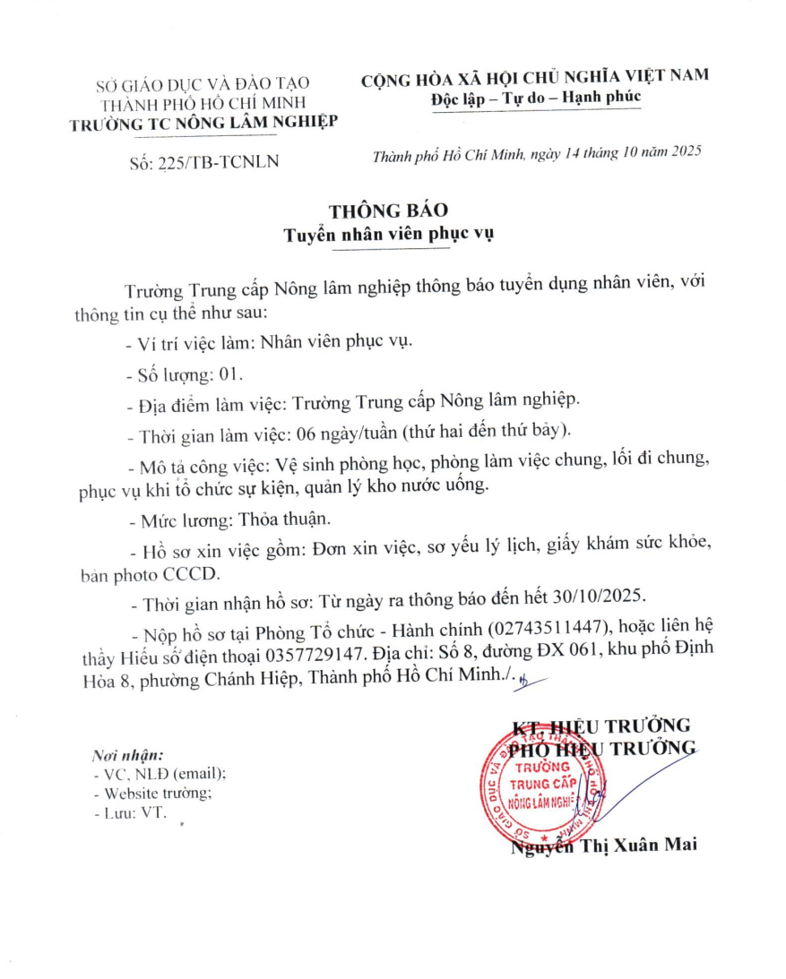 Trường Trung cấp Nông lâm nghiệp thông báo tuyển dụng giáo viên, kế toán, nhân viên văn thư - thủ quỹ