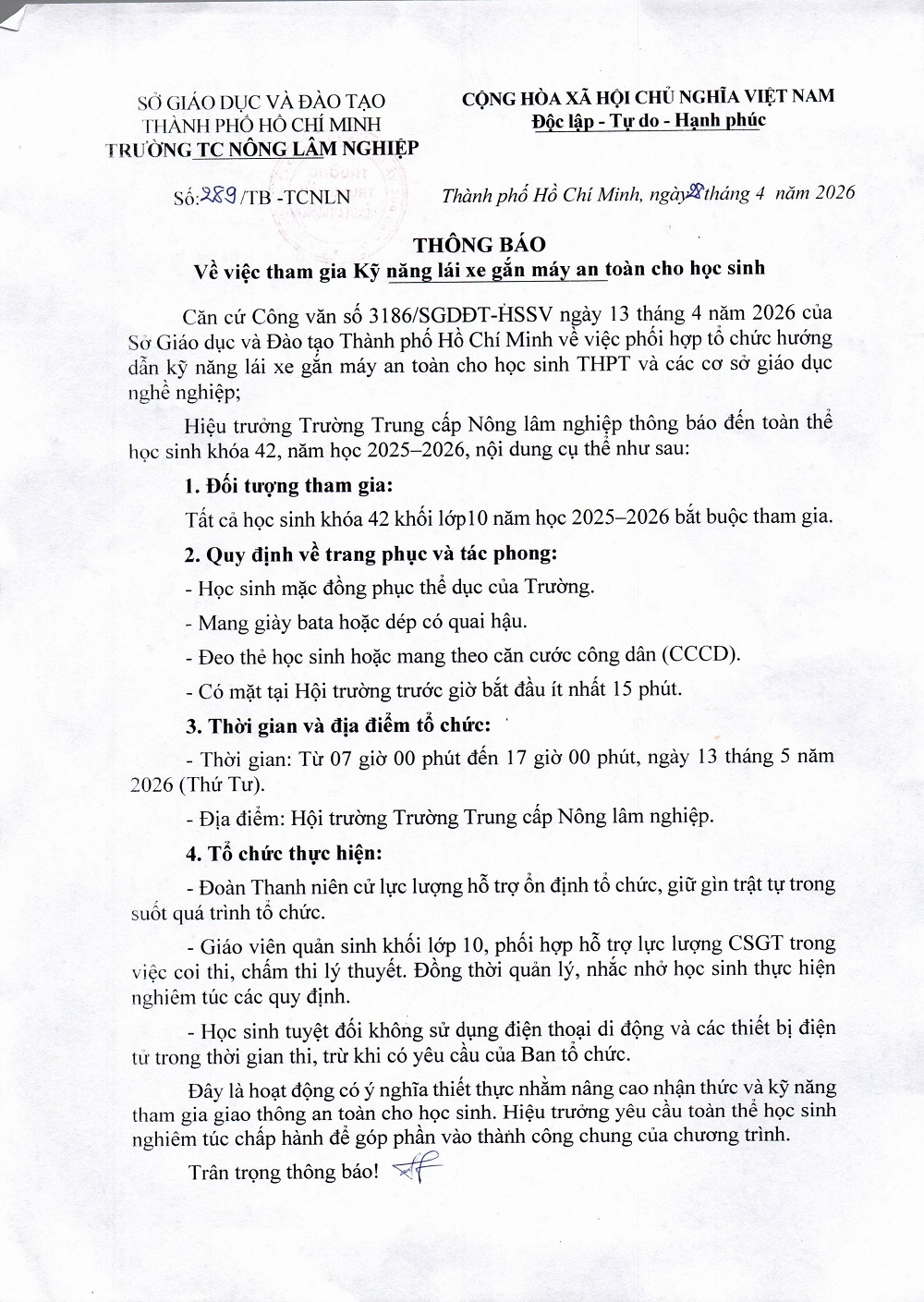 Thông báo tham gia kỹ năng lái xe gắn máy an toàn cho học sinh, ngày 13/5/2026