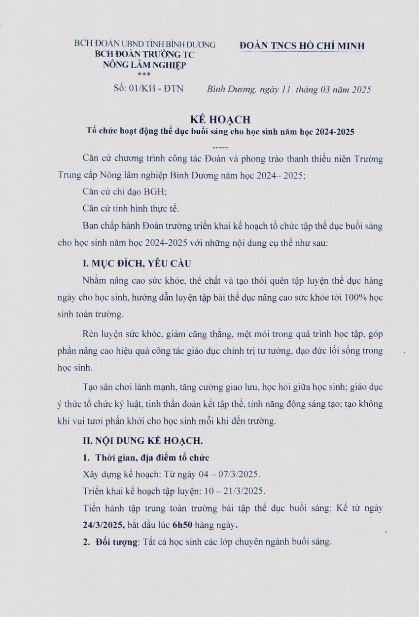 Kế hoạch tổ chức hoạt động thể dục buổi sáng từ ngày 17/03/2025
