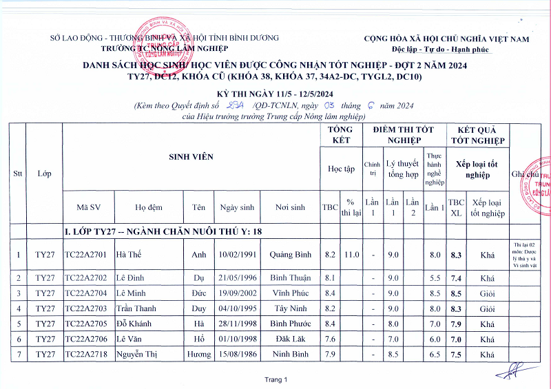 Điểm thi tốt nghiệp lớp Chăn nuôi - Thú y (TYGL2)