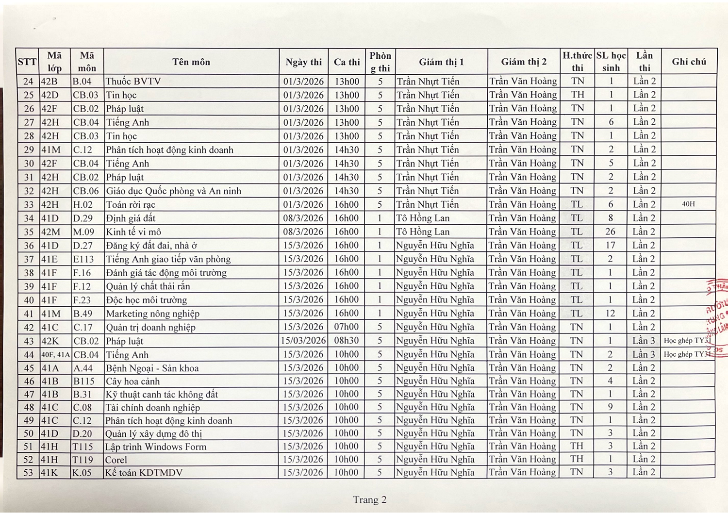 Lịch thi lại văn hóa 04 môn (K41VH ngày 10 và 11/01/2026)