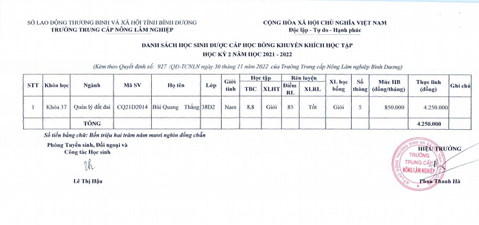 Danh sách nhận học bổng học kỳ 2, năm học 2021-2022